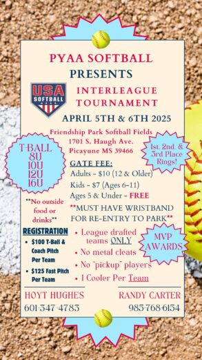 Below are brackets for this weekend’s 2025 D’Iberville Amanda Ward Rec League Team Tournament. The event will be held at the D’Iberville Sports Complex at 15641 MS Hwy 15, D’Iberville,…